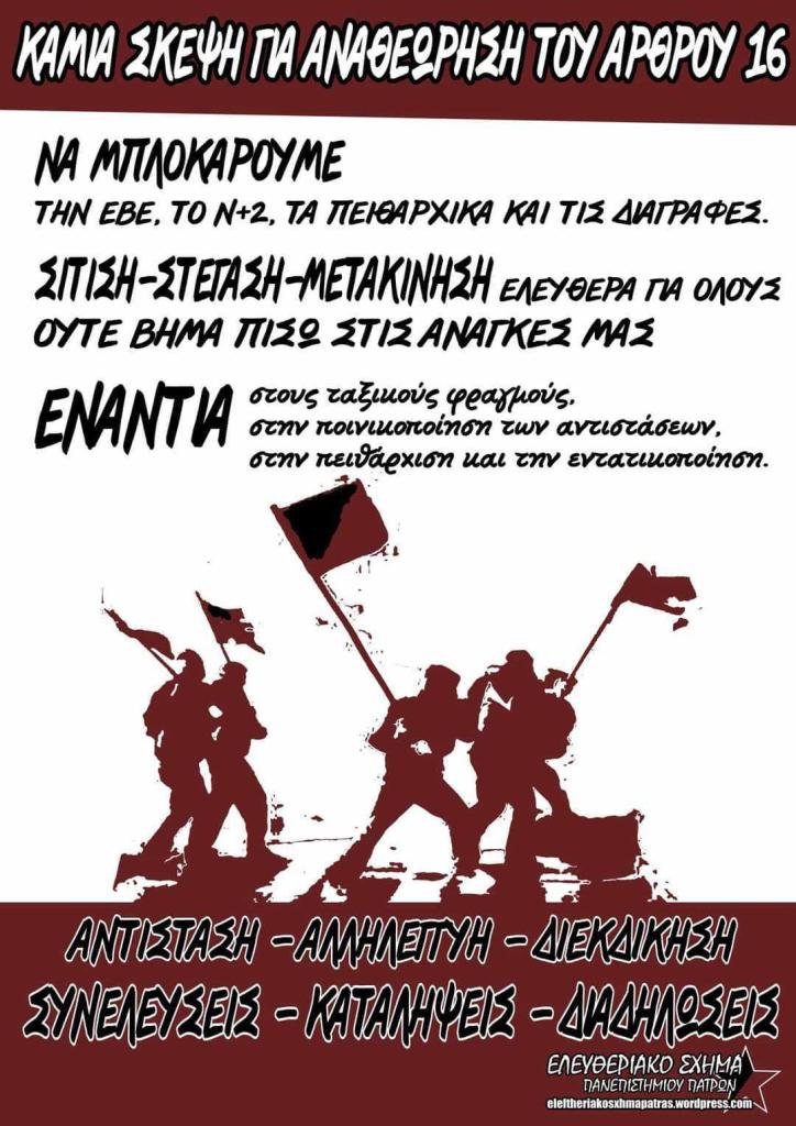 Την Πέμπτη το πρωί, κατά τη διάρκεια της πανεκπαιδευτικής πορείας στην Πάτρα, έγινε επίθεση στις αστυνομικές δυνάμεις με πέτρες και καπνογόνα στο ύψος της Ερμού στο αστυνομικό τμήμα. Η αστυνομία επιτέθηκε στην πορεία με αποτέλεσμα τη σύλληψη ενός συντρόφου. Ο σύντροφος περνάει αύριο το πρωί εισαγγελέα κατηγορούμενος για 4 πλημμελήματα.