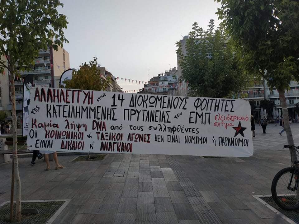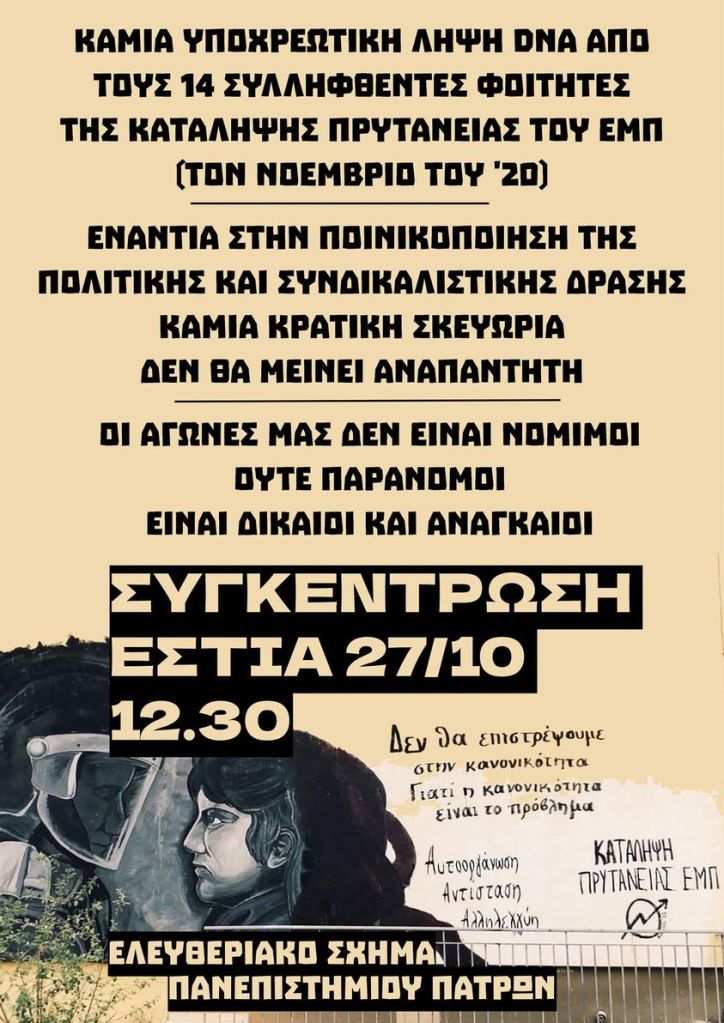 Tις τελευταίες μέρες έχει ξεκινήσει μια διαδικασία όπου η κρατική ασφάλεια καλεί σε υποχρεωτική λήψη DNA 14 άτομα, αγωνιζόμενους φοιτητές, που συμμετείχαν στην κατάληψη Πρυτανείας ΕΜΠ (13/11/20). Αυτό συμβαίνει, γιατί δείγμα DNA που βρέθηκε σε αντικείμενα μέσα στην κατειλημμένη πρυτανεία το Νοέμβριο του 2020 ταυτίστηκε με αυτό που βρέθηκε σε μια ματωμένη γάζα σε δρόμο των Εξαρχείων το Δεκέμβρη του 2014 μετά από συγκρούσεις με την αστυνομία.