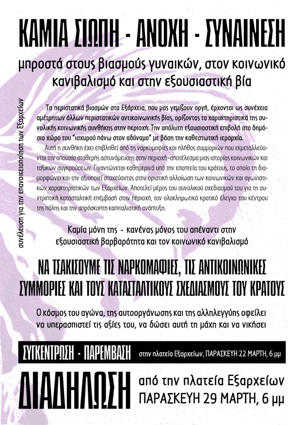 Η περιοχή των Εξαρχείων θα έπρεπε να αποτελεί πρότυπο ελευθεριακής γειτονιάς και παράδειγμα κοινωνικής και ταξικής αυτοοργάνωσης για τις υπόλοιπες. Αντί αυτού η συγκεκριμένη γειτονιά, ειδικά κατά την περίοδο της κρίσης, εξελίχθηκε σε μια γειτονιά που αναπτύχθηκαν και γενικεύτηκαν αντικοινωνικά και αντιδραστικά φαινόμενα γεγονός που δεν έλειψαν να εκμεταλλευτούν τα παπαγαλάκια της δημοσιογραφίας διαβάλλοντας δια μέσου της γειτονιάς συνολικά τον αγώνα του αναρχικού κινήματος. Παρ’ όλα αυτά είναι γεγονός ότι σε μεγάλο βαθμό η μοίρα αυτής της γειτονιάς είναι συνδεδεμένη με τα κοινωνικά προτάγματα και τους αγώνες αυτού του τόπου. Τα Εξάρχεια αποτέλεσαν χώρο αντίστασης στην Κατοχή, πεδίο αγώνα ενάντια στη Χούντα των Συνταγματαρχών και συνεχίζουν να αποτελούν χώρο του πιο δυναμικού κομματιού της κοινωνίας που εξεγείρεται απέναντι στις δολοφονίες ανυπόταχτων νέων και διαδηλωτών, το πιο ελπιδοφόρο πεδίο έκφρασης της ταξικής αλληλεγγύης. Έτσι λοιπόν η εικόνα της γειτονιάς των Εξαρχείων δεν μπορεί παρά να είναι η αντανάκλαση της σημερινής εικόνας του κινήματος. Τα Εξάρχεια σαν χώρος φαντασίας, πολιτικοποίησης και κοινωνικοποίησης θα πρέπει να μπορούν να ανταγωνίζονται και να κερδίζουν τόσο σε μορφή (καθιστώντας για αρχή τη γειτονιά βιώσιμη για τους κατοίκους της) όσο και σε περιεχόμενο (πολιτιστικό, κοινωνικό) τις καπιταλιστικές σχέσεις εξουσίας εφαρμόζοντας σχέσεις και δομές Αντιεξουσίας. Όχι φυσικά καθιστώντας την περιοχή μια νησίδα εναλλακτικής «ελευθερίας» αλλά χτίζοντας μια γειτονιά πρότυπο αντίστασης απέναντι στον πόλεμο που μας κήρυξε η τρόικα, αλλά και εναντίον του εγχώριου πολιτικού και οικονομικού συστήματος που συνέπραξε στη γενοκτονία εναντίον του χειμαζόμενης κοινωνίας. Για να υπηρετήσουμε όμως εύστοχα τους στρατηγικούς σχεδιασμούς μας θα πρέπει εξίσου εύστοχα και νικηφόρα να περιφρουρήσουμε τους ενδιάμεσους τακτικούς στόχους πάλης αφού για εμάς είναι κάτι περισσότερο από αυτονόητο ότι ένα κίνημα χωρίς αρχές, είναι ένα κίνημα χωρίς πολιτικό περιεχόμενο όπως και το αντίστροφο φυσικά. Ο αγώνας ενάντια στις ναρκωμαφίες, την κρατική καταστολή και τον κοινωνικό κανιβαλισμό συνοψίζει την τακτική της συνέλευσής μας ορίζοντας παράλληλα αυτές τις έννοιες όχι σαν κάτι διαιρεμένο μεταξύ τους, αλλά σαν τμήμα μιας ενοποιημένης στρατηγικής του κράτους και του κεφαλαίου απέναντι σε όσους αντιστέκονται. Για αυτόν ακριβώς το λόγο δεν θα μπορούσαμε να μείνουμε σιωπηλοί μπροστά στα φαινόμενα του κοινωνικού κανιβαλισμού αφού η επίδρασή τους τόσο στη γειτονιά μας όσο και στις γραμμές του κινήματος είναι καθοριστική. Η απάθεια σε αυτά τα περιστατικά, όπως ορισμένα καταγράφονται παρακάτω, δε σημαίνει ουδετερότητα αλλά συνενοχή στο μονοπώλιο άσκησης και επιβολής εξουσιαστικών απόψεων και συμπεριφορών. Που αν επικρατήσουν θα μεταλλάξουν δομικά τόσο το περιεχόμενο, όσο και την ουσία του απελευθερωτικού αγώνα. Γιατί είναι ξεκάθαρο ότι οι ευθύνες βαραίνουν συλλογικά όλους εμάς, οργανωμένες ομάδες και μεμονωμένους συντρόφους, και αν επιλέξουμε να αναμετρηθούμε μαζί τους θα έρθουμε αντιμέτωποι με δομικές παθογένειες και κενά που έδωσαν χώρο στην ανάπτυξη της γάγγραινας εντός του κινήματος. Γιατί η συγκρότηση του κινήματος σήμερα είναι καθήκον και ιστορική αποστολή όσων αγωνίζονται για να αλλάξουν τον κόσμο.