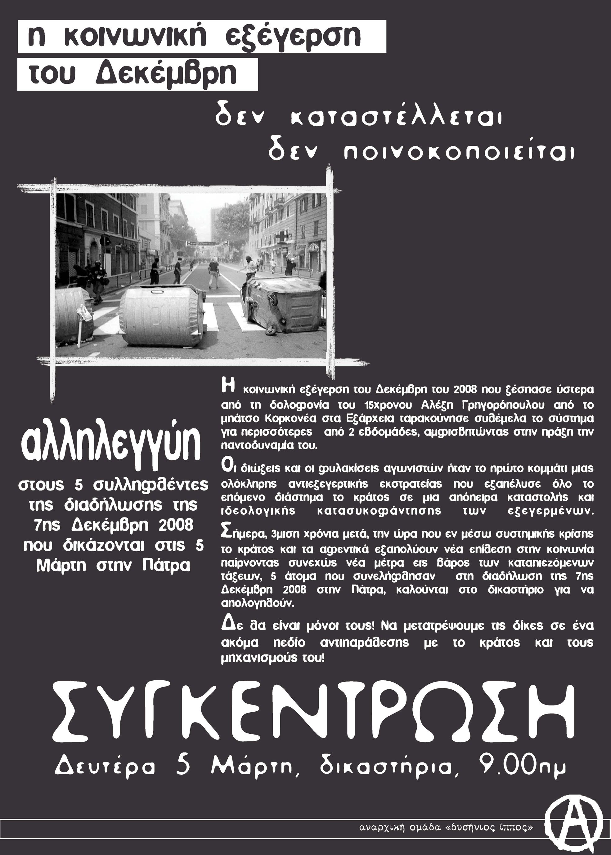 Τα τελευταία 2,5 χρόνια συντελείται μια διαρκής και ολοένα εντεινόμενη επίθεση σε βάρος της κοινωνίας από τα εγχώρια πολιτικά και οικονομικά αφεντικά και τους υπερεθνικούς τους συμμάχους (ΕΕ-ΕΚΤ-ΔΝΤ) που έχει διαμορφώσει μια ζοφερή, αποπνικτική ατμόσφαιρα για εκατομμύρια προλετάριους. Διαρκείς περικοπές σε μισθούς, επιδόματα και συντάξεις, τρομακτική αύξηση του ποσοστού των ανέργων που σύμφωνα με επίσημα στοιχεία αγγίζει το 26%, επιβολή δυσβάστακτων φόρων ακόμα και στα πιο βασικά είδη πρώτης ανάγκης όπως η στέγαση και η σίτιση, συνθέτουν ένα σκηνικό φτώχειας και εξαθλίωσης που οδηγεί βίαια τεράστια κοινωνικά κομμάτια στην έξοδο, είτε μέσω της περιθωριοποίησης είτε μέσω του αργού θανάτου και της αυτοκτονίας. Πρόσφατα, η πολιτική διαχείριση του καπιταλισμού στη χώρα πέρασε ένα ακόμα πακέτο οικονομικών μέτρων, μέσα από τη διαδικασία του κατεπείγοντος, που προωθεί την αύξηση των ορίων συνταξιοδότησης, πλήθος απολύσεων στο δημόσιο και τον ιδιωτικό τομέα, περικοπές στον τομέα της υγείας, σε οικογενειακά επιδόματα, σε χαμηλές συντάξεις κ.α. Όλα αυτά σε μια περίοδο που οι εργασιακές σχέσεις είναι ήδη διαλυμένες από τα προηγούμενα μέτρα κοινωνικής εξόντωσης και η βασική συνθήκη δουλειάς είναι η μαύρη, ανασφάλιστη και ελαστική εργασία για ένα κομμάτι ψωμί, χωρίς δικαιώματα και χωρίς πολλές απαιτήσεις.