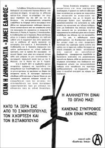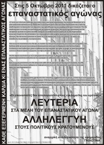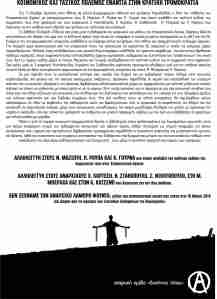 Μέσα σ’ αυτή τη ζοφερή κοινωνική πραγματικότητα λοιπόν, η αλληλεγγύη στους φυλακισμένους και διωκόμενους αγωνιστές, είναι μια ακόμα αναφαίρετη στιγμή του καθημερινού κοινωνικού και ταξικού αγώνα, καθώς λειτουργεί ως σημείο αναφοράς για όσους αντιστέκονται στην κρατική και καπιταλιστική βαρβαρότητα, προσφέροντας παράλληλα τη δυνατότητα ανάπτυξης της ριζοσπαστικής κριτικής και δράσης, αλλά και συνάντησης των επιμέρους αντιστάσεων που διεξάγονται στα διαφορετικά μέτωπα του κοινωνικοταξικού πολέμου στην κατεύθυνση της περαιτέρω συλλογικοποίησης και διεύρυνσης τους, μέχρι τη συνολική ανατροπή του κόσμου των κυρίαρχων.