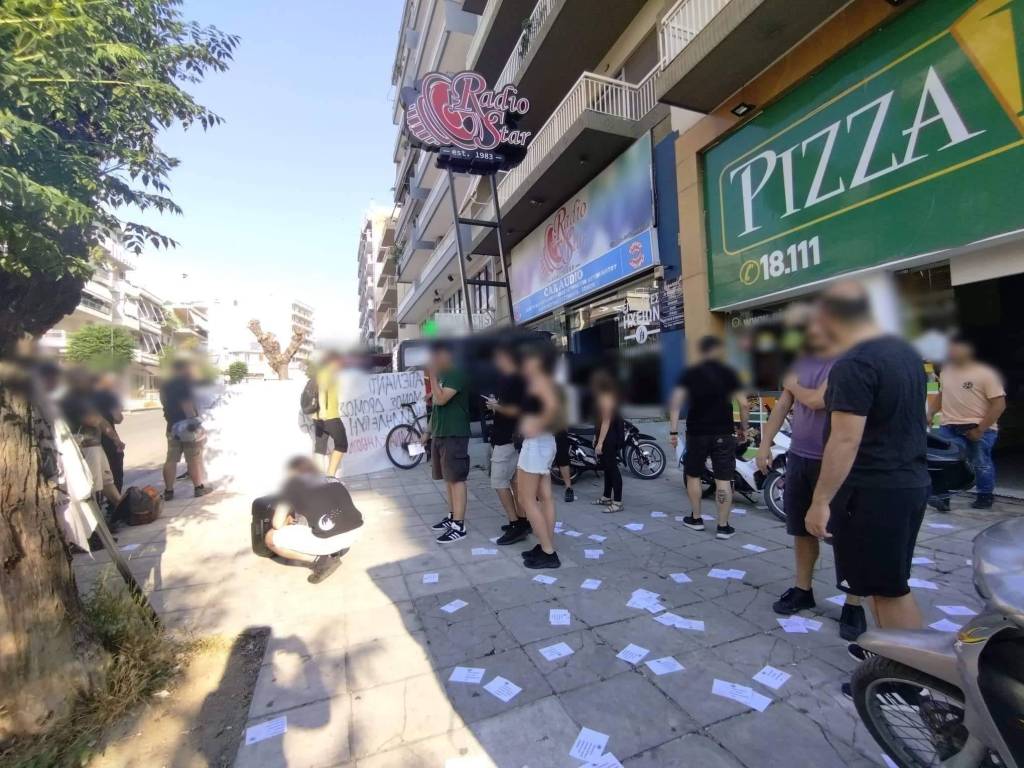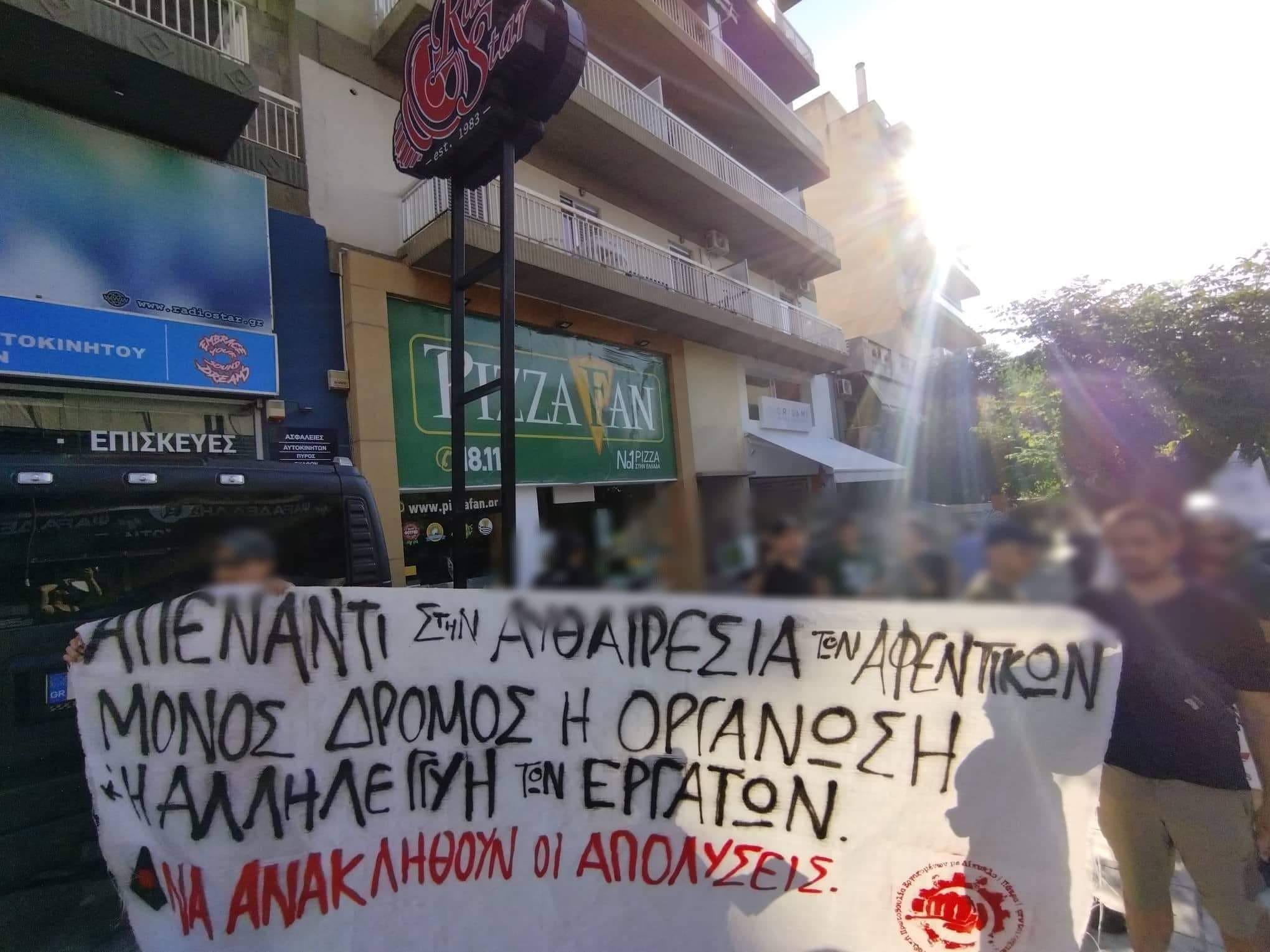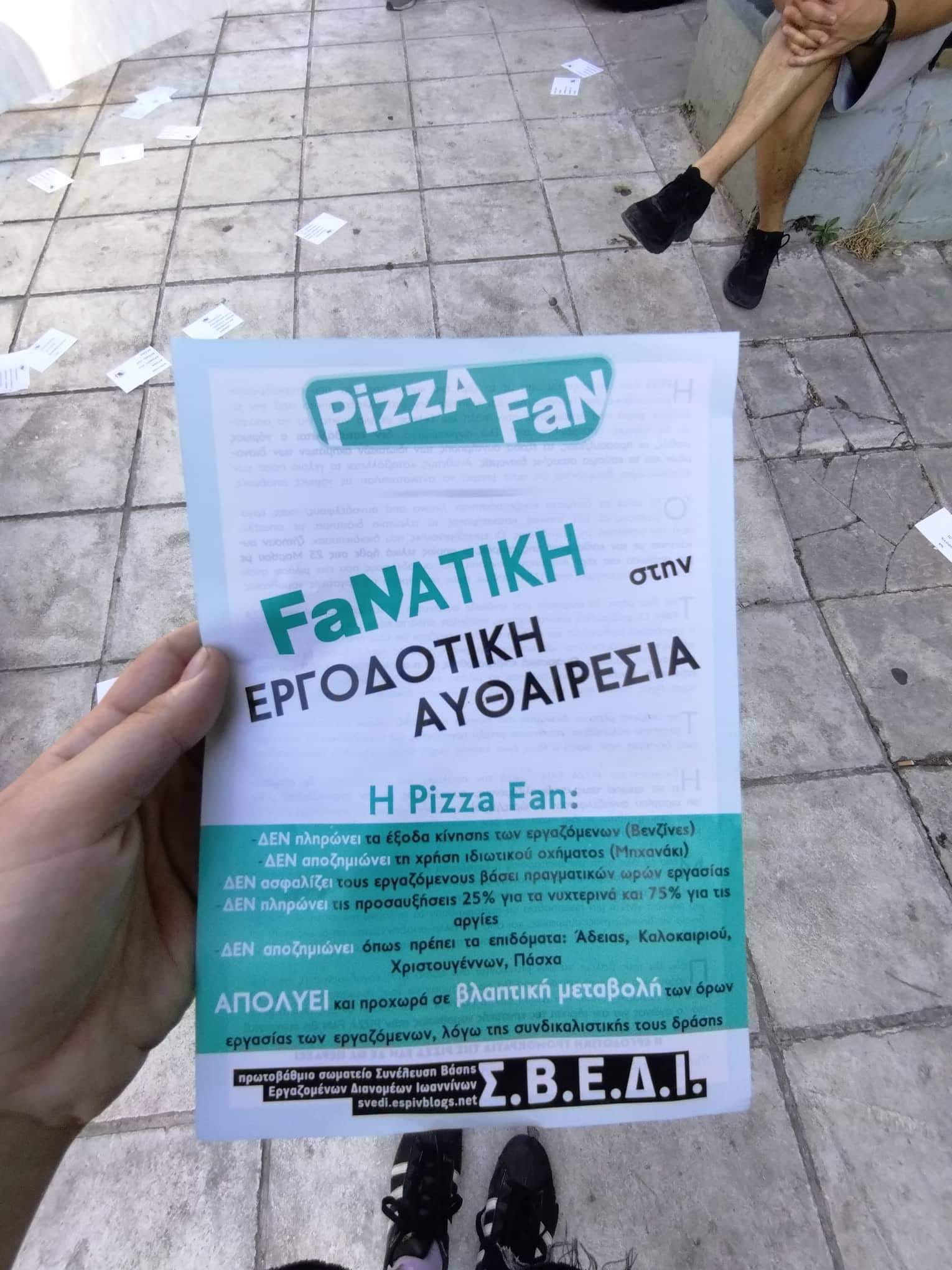 Φωτογραφίες από την παρέμβαση στην Pizza Fan στην Αγίας Σοφίας με αφορμή τις απολύσεις και τις εργοδοτικές αυθαιρεσίες σε μαγαζί της εταιρίας στην πόλη των Ιωαννίνων.