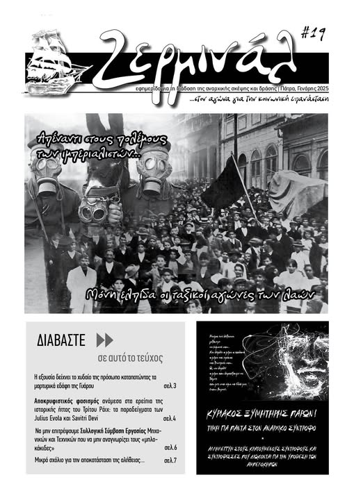 Χέρι με χέρι στους δρόμους και σε κινητοποιήσεις, καθώς και σε πολιτικούς-κοινωνικούς χώρους σε διάφορες πόλεις, θα βρείτε το 19ο τεύχος της εφημερίδας Ζερμινάλ που ήδη κυκλοφορεί με άρθρα για την πολιτικοκοινωνική συγκυρία, το Παλαιστινιακό ζήτημα, τη Συλλογική Σύμβαση στον κλάδο των μηχανικών και των τεχνικών και την κοροϊδία των εργοδοτικών φορέων, την πρόθεση της καταπάτησης των μαρτυρικών εδαφών της Γυάρου από την εξουσία, τον αποκρυφιστικό φασισμό ανάμεσα στα ερείπια της ιστορικής ήττας του Τρίτου Ράιχ. Στην εφημερίδα περιλαμβάνονται και παρουσιάσεις των τελευταίων εκδόσεων του Δυσήνιου Τύπου.