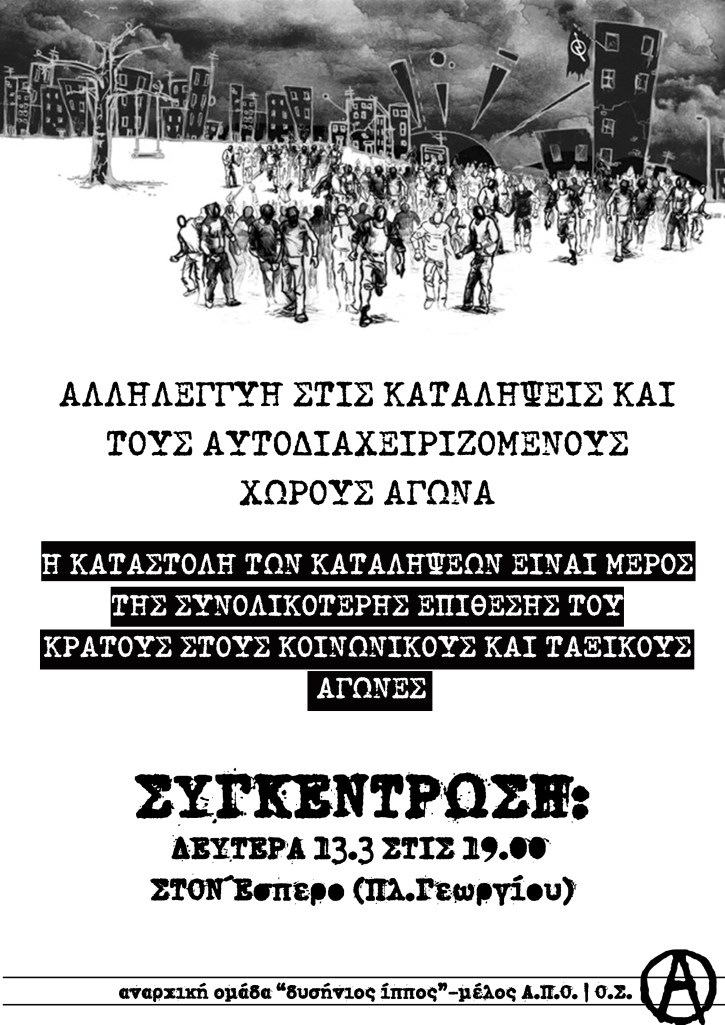 «Η διαρκώς κλιμακούμενη επίθεση των κυρίαρχων πάνω στα στοιχειώδη δικαιώματα και τους όρους ζωής των από κάτω της κοινωνίας συνοδεύεται από την αντίστοιχη όξυνση και κλιμάκωση της κρατικής και παρακρατικής καταστολής των αντιστάσεων. Και ιδιαίτερα εκείνων των αντιστάσεων που δεν ελέγχονται και δεν περιορίζονται από τους θεσμούς, τους φορείς και τους παράγοντες του συστήματος, αλλά εκδηλώνονται ακηδεμόνευτα, επιχειρώντας το πέρασμα από την αυθόρμητη διαμαρτυρία και αγανάκτηση των καταπιεσμένων και εκμεταλλευόμενων ανθρώπων στη συνειδητή εξέγερση και την κοινωνική επανάσταση ως μοναδική απάντηση-διέξοδο στην κρίση του συστήματος και την επίθεση της άρχουσας τάξης. Οι καταλήψεις και γενικότερα οι αυτοδιαχειριζόμενοι χώροι είναι συγκεκριμένο κομμάτι αυτής της συνειδητής και αυτοοργανωμένης αντίστασης, και έχουν διαδραματίσει σημαντικό ρόλο στην ανάπτυξη και την εξέλιξη των ευρύτερων κοινωνικών αγώνων τις τελευταίες δεκαετίες. Για αυτό και βρίσκονταν πάντα στο στόχαστρο της κρατικής καταστολής και των παρακρατικών συμμοριών». ΛΚ 37, Γενάρης 2012