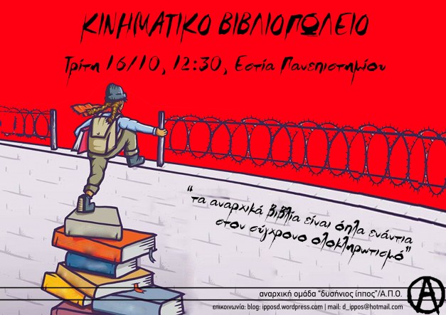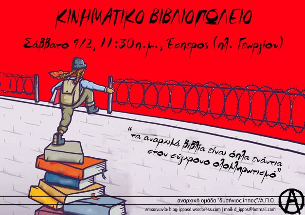 Τα τελευταία 5 χρόνια λειτουργεί στην πόλη της Πάτρας το κινηματικό βιβλιοπωλείο της αναρχικής ομάδας “δυσήνιος ίππος”. Το εγχείρημα αυτό αποτελεί βασικό κομμάτι της ευρύτερης προσπάθειας μας για την κοινωνικοποίηση των προταγμάτων του αναρχικού και ευρύτερα του κοινωνικού – ταξικού αγώνα στο σήμερα, για την εξάπλωση και διάδοση της αναρχικής/αντιεξουσιαστικής/ελευθεριακής αντίληψης, κουλτούρας και πρακτικής, για την διατήρηση της κοινωνικής-ταξικής μνήμης ενάντια στη λήθη που προσπαθούν να επιβάλλουν οι εξουσιαστές και για την ανάδειξη -στο μέτρο του δυνατού- του πλούτου των αναρχικών αντιλήψεων και πρακτικών, των προτάσεων, των θέσεων και των αγώνων των αναρχικών πάνω σε μια σειρά από ζητήματα που διατρέχουν την πολιτική και κοινωνική πραγματικότητα της εποχής μας. Continue reading “ΛΙΓΑ ΛΟΓΙΑ ΓΙΑ ΤΟ ΚΙΝΗΜΑΤΙΚΟ ΒΙΒΛΙΟΠΩΛΕΙΟ ΤΟΥ “ΔΥΣΗΝΙΟΥ ΙΠΠΟΥ””