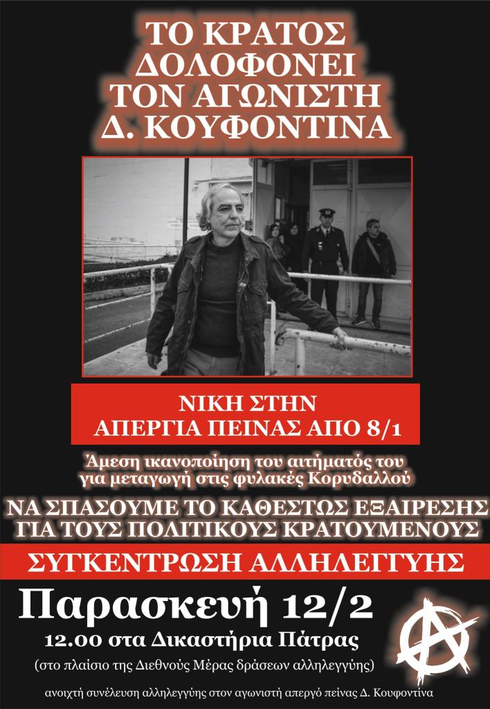 Καλούμε σε συγκέντρωση και πορεία αλληλεγγύης στον απεργό πείνας αγωνιστή Δημήτρη Κουφοντίνα στις 12.30 μ.μ. στην πλατεία Γεωργίου την Παρασκευή 26/2, στο πλαίσιο της 7ης Πανελλαδικής ημέρας αλληλεγγύης