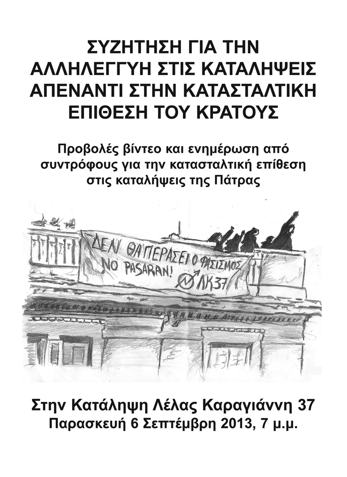 Είναι φανερό ότι οι επιθέσεις στις καταλήψεις στην Πάτρα δεν είναι μόνο η συνέχεια ενός κατασταλτικού σχεδίου, αλλά και το προοίμιο νέων επιθέσεων. Κατά συνέπεια, είναι επιτακτικό όχι μόνο να εκφράσουμε την αλληλεγγύη μας στις καταλήψεις που χτυπήθηκαν αλλά και να προασπίσουμε τις υπάρχουσες καταλήψεις σε όλη τη χώρα που προοιωνίζεται η καταστολή τους.
