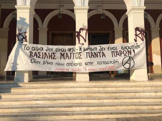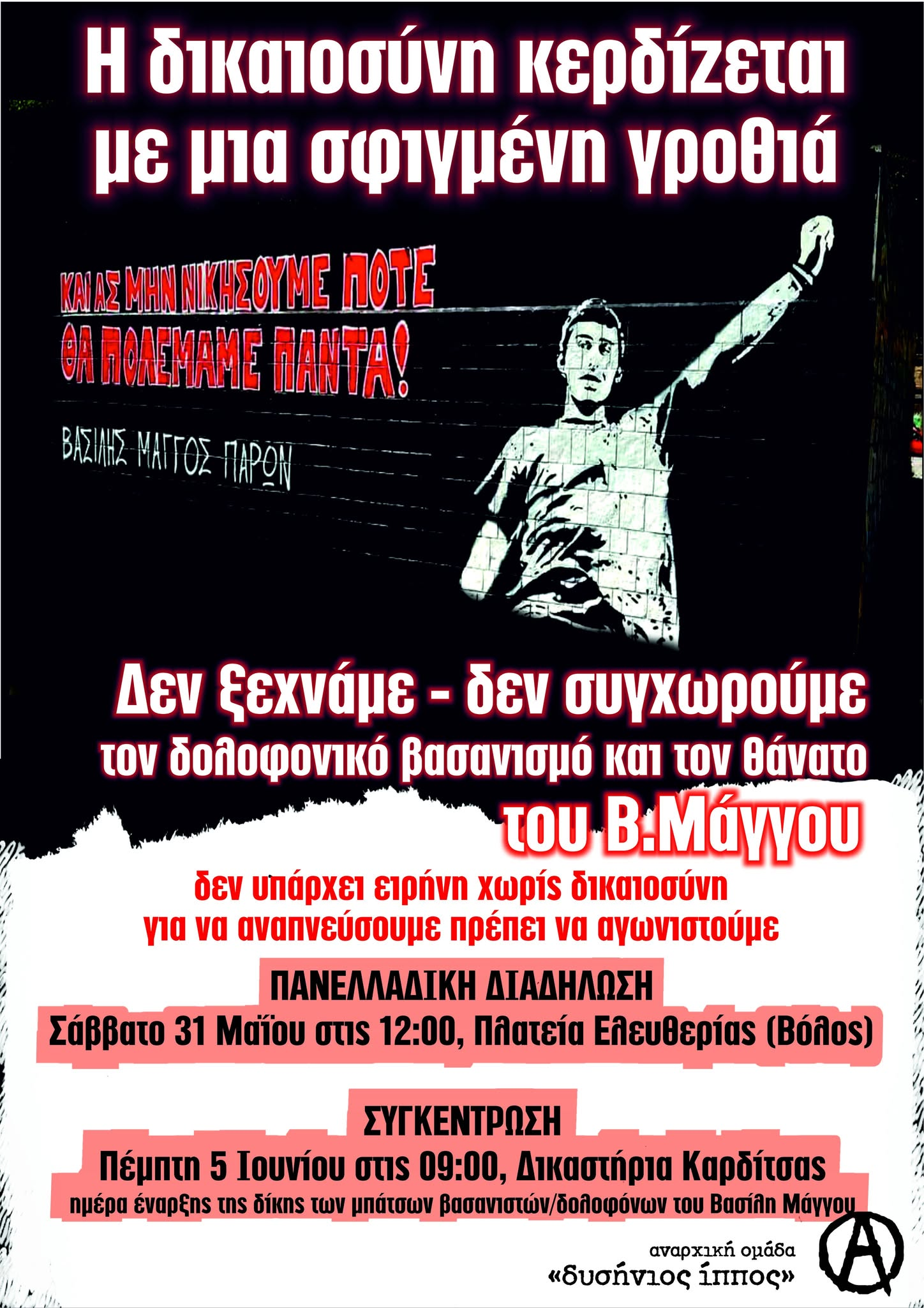 Το χτύπημα που οργανώθηκε απέναντι στους αγωνιζόμενους κατοίκους του Βόλου στις 13 και 14 Ιουνίου 2020 ζητούσε αίμα διαδηλωτών και ήταν μια ακόμα στιγμή της γενικευμένης κατασταλτικής εκστρατείας του κράτους απέναντι σε όσους αντιστέκονται, ένα ακόμα επεισόδιο του κοινωνικού πολέμου που εξαπολύει το κρατικό και καπιταλιστικό σύστημα στο πλαίσιο του οποίου εντάσσεται ο θάνατος χιλιάδων, η καταδίκη ακόμα περισσότερων στη φτώχεια και την ανέχεια, η ολοκληρωτική λεηλασία του φυσικού κόσμου.Περίπου ένα μήνα μετά, στις 13 Ιουλίου 2020, ο Βασίλης Μάγγος βρέθηκε νεκρός στο σπίτι του από τη μητέρα του. Οι εγκληματικές πρακτικές των κρατικών μηχανισμών, ωστόσο, δεν σταματούν εδώ, αφού κατά τη νεκροψία του πραγματοποιούνται διάφορες ανεξήγητες μεθοδεύσεις, η σορός του απαγάγεται και μεταφέρεται στη Θεσσαλονίκη, ενώ η κυβέρνηση, δια στόματος υπουργού Προ. Πο. Χρυσοχοϊδη, σπεύδει να προκαταλάβει την ιατροδικαστική έρευνα και να αθωώσει τους μπάτσους-βασανιστές του Βασίλη.