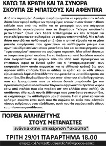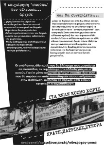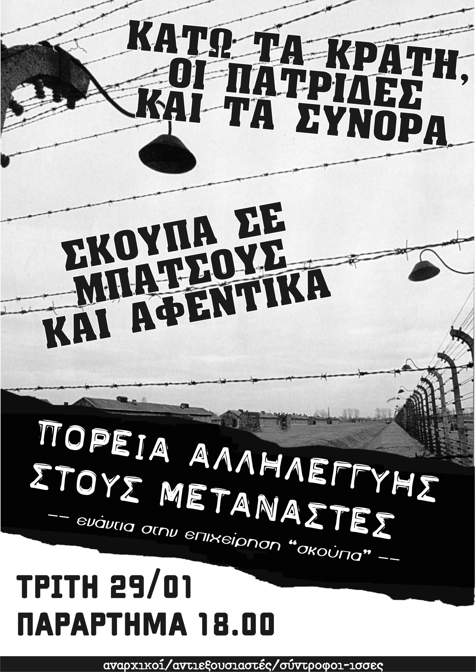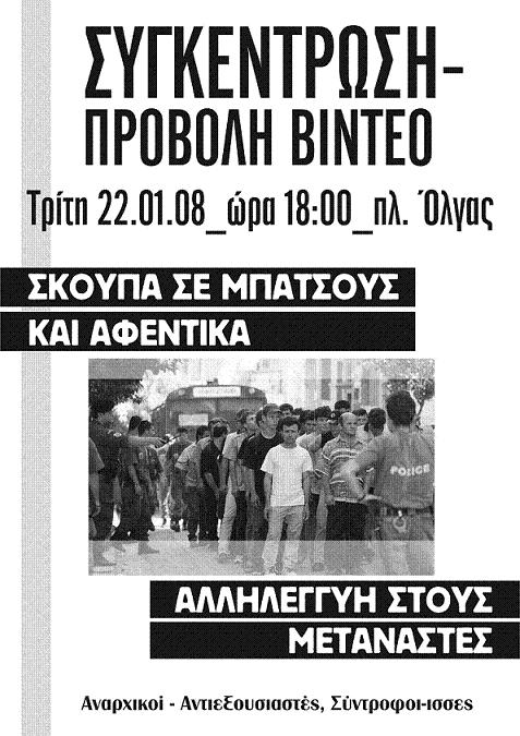 Υ.Γ.2 Ντροπή -αηδία -οργή, για τη δολοφονία του Αριβάν από λιμενόμπατσο, που συνεχίζει να κάνει κανονικά τη δουλειά του, για τις επιθέσεις που έγιναν από την αστυνομία στον αυτόπτη μάρτυρα και τις απειλές τους προς αυτόν, για τους ξυλοδαρμούς στο λιμάνι και στο τμήμα, για τα ντου στον καταυλισμό από μπάτσους και φασίστες, τους πυροβολισμούς και το κάψιμο των προσωπικών αντικειμένων, για τις σκούπες και τους ξυλοδαρμούς στη γέφυρα, για τους 18 νεκρούς κούρδους σε νταλίκα το 2008 από ασφυξία, για τους ξυλοδαρμούς μεταναστών στο λιμάνι από λιμενόμπατσους με ρόπαλα του μπέιζμπολ, για τους ΔΙΑΣ που τους κυνηγούν ακόμα και όταν ψάχνουν στα σκουπίδια για ένα κομμάτι ψωμί, για τα supermarket που δεν τους επιτρέπουν την είσοδο. Σ’αυτή τη συγκυρία της κρίσης που βρίσκεται το καπιταλιστικό σύστημα σε όλους τους τομείς του είναι αναμενόμενη η επέκταση των ρατσιστικών-φασιστικών αντιλήψεων και ανάλογων πράξεων ενάντια στο πλέον καταπιεσμένο κομμάτι της κοινωνίας, τους μετανάστες. Εμείς στεκόμαστε αλληλέγγυοι στους ανθρώπους αυτούς και ερχόμαστε σε σύγκρουση με το κράτος και το κεφάλαιο που αναπαράγουν και ενισχύουν το κοινωνικό και θεσμικό ρατσισμό που είναι διάχυτος και διαχωρίζει τους ανθρώπους.