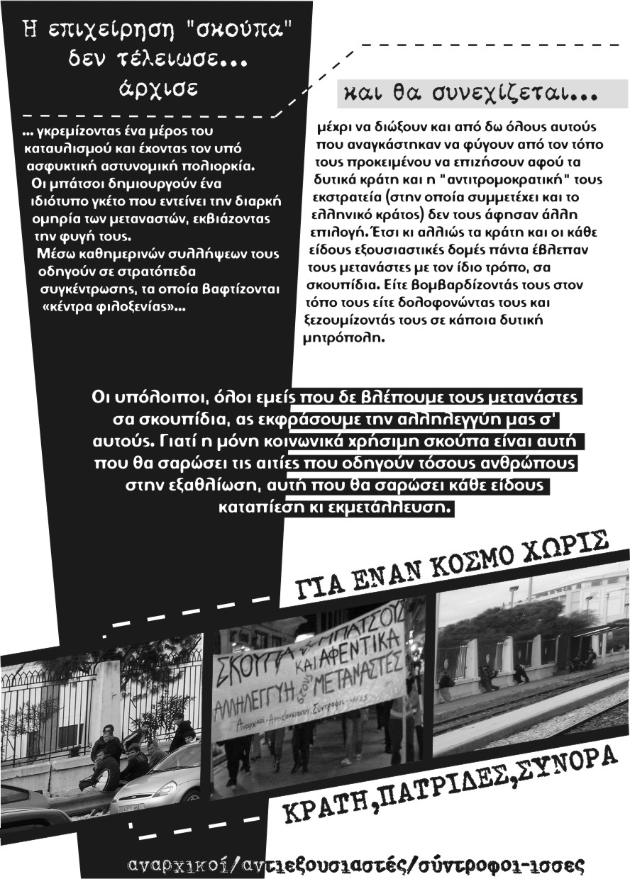 Απευθυνόμαστε σε ένα ευρύ φάσμα συντρόφων πληροφορώντας για την κατάσταση και τις απειλές που δεχόμαστε και ταυτόχρονα οργανώνουμε τις συλλογικές μας απαντήσεις απέναντι στις φασιστικές παρακρατικές συμμορίες, την αστυνομική χούντα και την κρατική μεταναστευτική πολιτική, που οργανώνει γκέτο και προωθεί το ρατσισμό και τον κοινωνικό κανιβαλισμό. Κανείς καταπιεσμένος δεν είναι μόνος του.