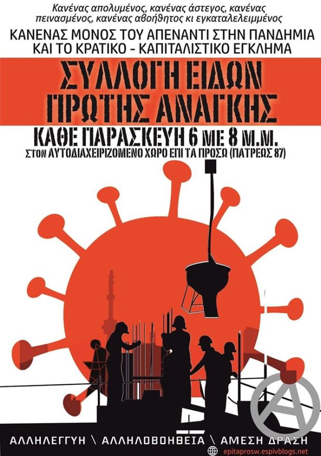 Μπροστά στην επέλαση της πανδημίας και της κρατικής-καπιταλιστικής βαρβαρότητας που εντείνεται το τελευταίο διάστημα, οι πρόσφυγες και οι μετανάστες βιώνουν ένα αδιανόητο καθεστώς εξαίρεσης, όντας απροστάτευτοι και σε απάνθρωπες συνθήκες εξαθλίωσης παντού, από την Ριτσώνα, τη Μόρια και τα άλλα στρατόπεδα συγκέντρωσης που στοιβάζονται από το κράτος, από το κέντρο της Αθήνας όπου βρίσκονται εγκαταλελειμμένοι ύστερα από τις εξώσεις από τα σπίτια που διέμεναν και από τις εκκενώσεις των προσφυγικών καταλήψεων, μέχρι τη Μανωλάδα και τα παλιά εργοστάσια της Πάτρας.