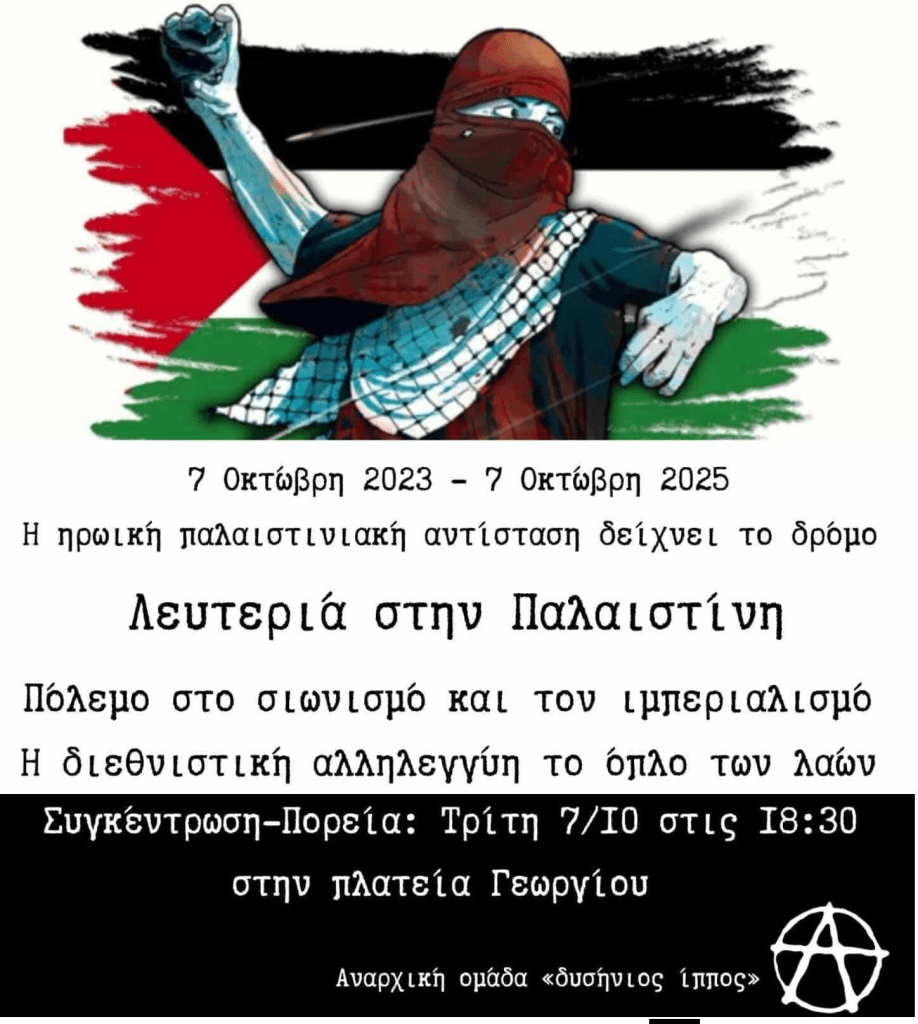 Σε μια εποχή γενοκτονίας και ιμπεριαλιστικής βαρβαρότητας, οι λαοί ενώνουν τις φωνές τους με τον δοκιμαζόμενο παλαιστινιακό λαό. Καταδικάζοντας με κάθε τρόπο τη συνεχιζόμενη σφαγή του παλαιστινιακού λαού από το κράτος του Ισραήλ, με την κάλυψη των ΗΠΑ, της ΕΕ και της ελληνικής κυβέρνησης.