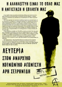 Αφίσα που κολλιέται από συντρόφους και συντρόφισσες σε Αθήνα, Πάτρα, Αγρίνιο, Άρτα και Ηγουμενίτσα ενόψει της δίκης του Αρη Σειρηνίδη που θα διεξαχθεί στις 9 Μάρτη στην Αθήνα.