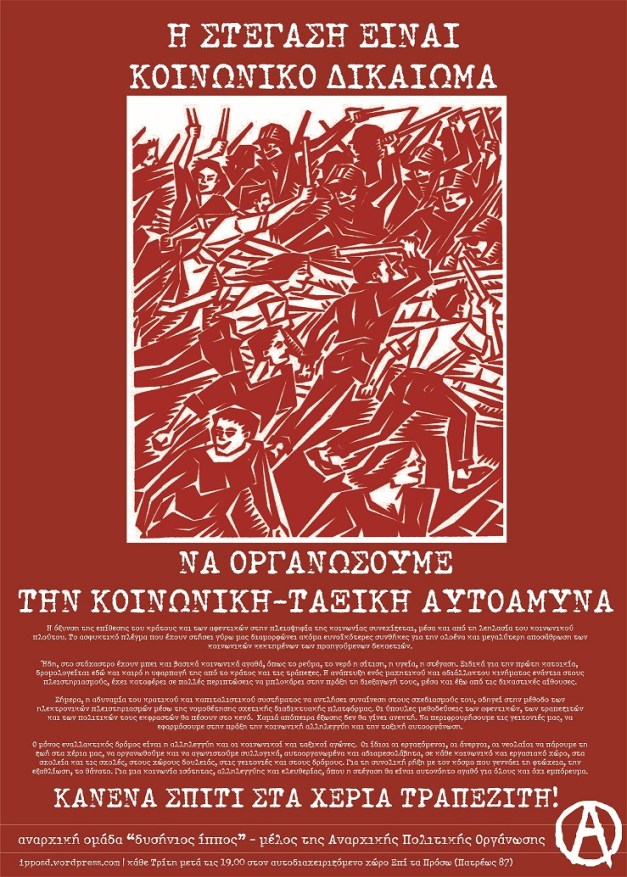 Τονίζουμε πως οι ύπουλες μεθοδεύσεις του κράτους, των αφεντικών, των τραπεζιτών και των συμβολαιογραφικών τους εκπροσώπων θα πέσουν στο κενό. Καμιά απόπειρα έξωσης δεν θα γίνει ανεκτή. Να περιφρουρήσουμε τις γειτονιές μας, να εφαρμόσουμε στην πράξη την κοινωνική αλληλεγγύη και την ταξική αυτοοργάνωση.