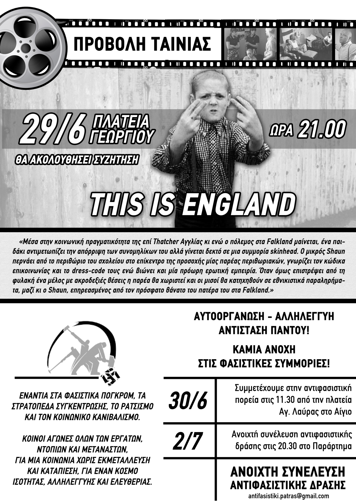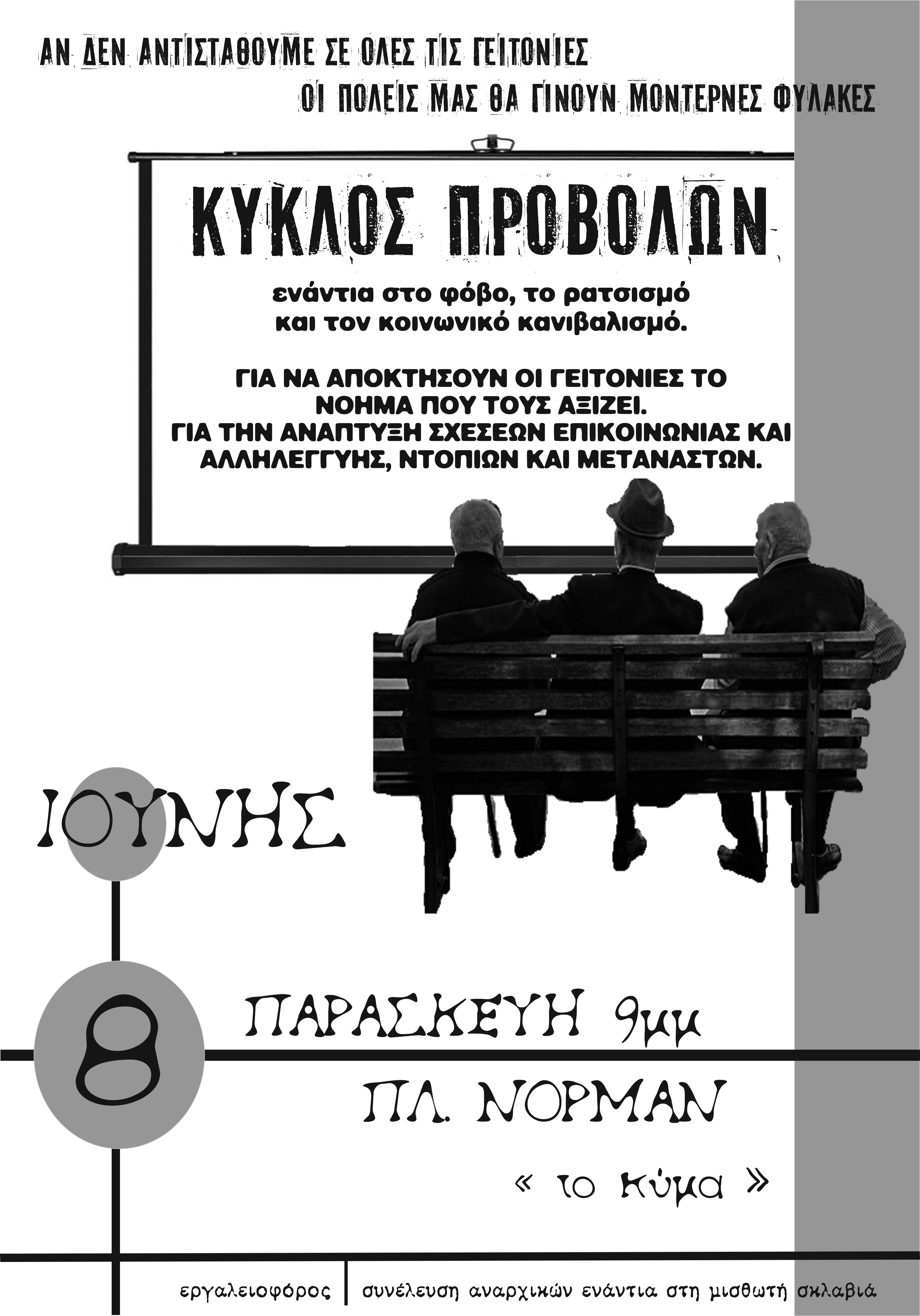 Το Σάββατο 10 Σεπτέμβρη πραγματοποιήθηκε προβολή της ταινίας “ο Βασιλιάς” στην πλατεία Ομονοίας στην Πάτρα από τη συνέλευση αναρχικών ενάντια στη μισθωτή σκλαβιά “ο εργαλειοφόρος”. Ο Βασιλιάς, γυρισμένος το 2002 από το Ν. Γραμματικό, είναι μια ταινία που βασίζεται σε αληθινά γεγονότα. Ο σκηνοθέτης διάβασε όσα διαδραματίστηκαν, σε ένα μονόστηλο κάποιας εφημερίδας και αποφάσισε να τα αποτυπώσει στην οθόνη. Όλες οι συντηρητικές αντιλήψεις μιας κοινωνίας περιγράφονται στο έργο. Ξενοφοβία, φόβος, μικροιδιοκτησία, στοιχεία ενός ρατσισμού στην πιο “καθαρή” του μορφή. Η αποδομηση της “αγίας” ελληνικής επαρχίας συντελείται με την βoήθεια ενός αντι-μπάτσου.