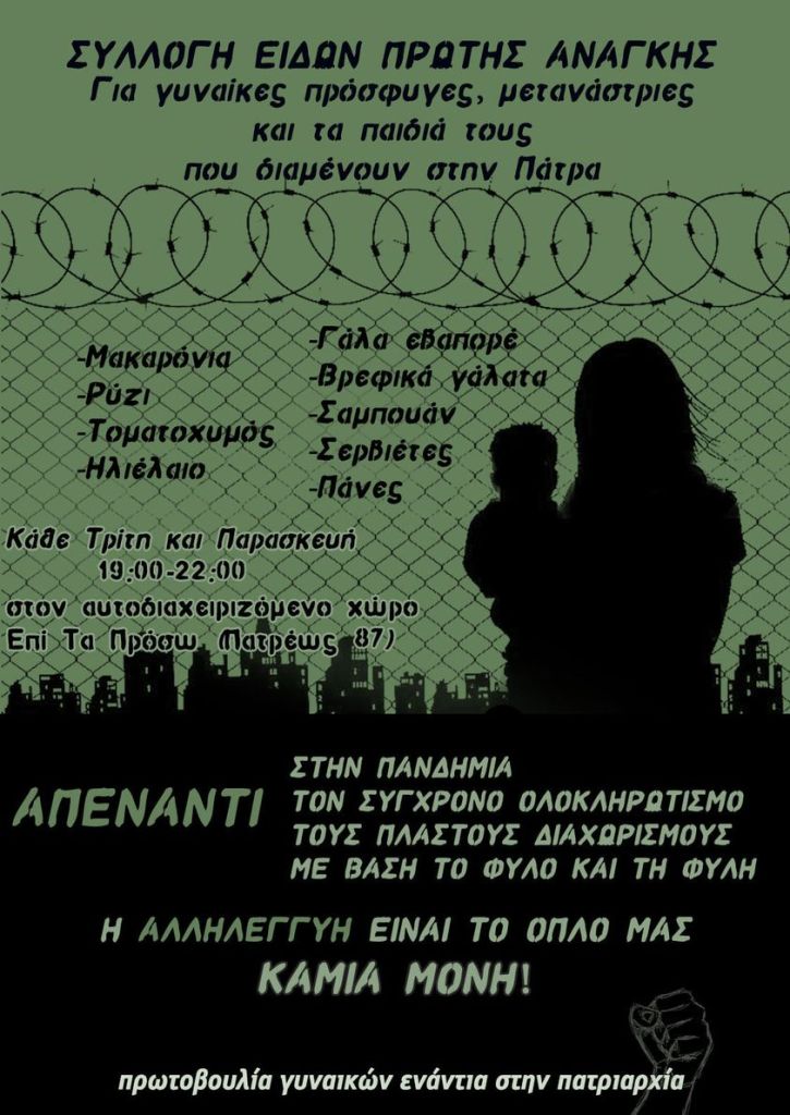 Μπροστά στην επέλαση της πανδημίας και της κρατικής-καπιταλιστικής βαρβαρότητας που εντείνεται το τελευταίο διάστημα, οι πρόσφυγες και οι μετανάστες βιώνουν ένα αδιανόητο καθεστώς εξαίρεσης, όντας απροστάτευτοι και σε απάνθρωπες συνθήκες εξαθλίωσης παντού, από την Ριτσώνα, τη Μόρια και τα άλλα στρατόπεδα συγκέντρωσης που στοιβάζονται από το κράτος, από το κέντρο της Αθήνας όπου βρίσκονται εγκαταλελειμμένοι ύστερα από τις εξώσεις από τα σπίτια που διέμεναν και από τις εκκενώσεις των προσφυγικών καταλήψεων, μέχρι τη Μανωλάδα και τα παλιά εργοστάσια της Πάτρας.