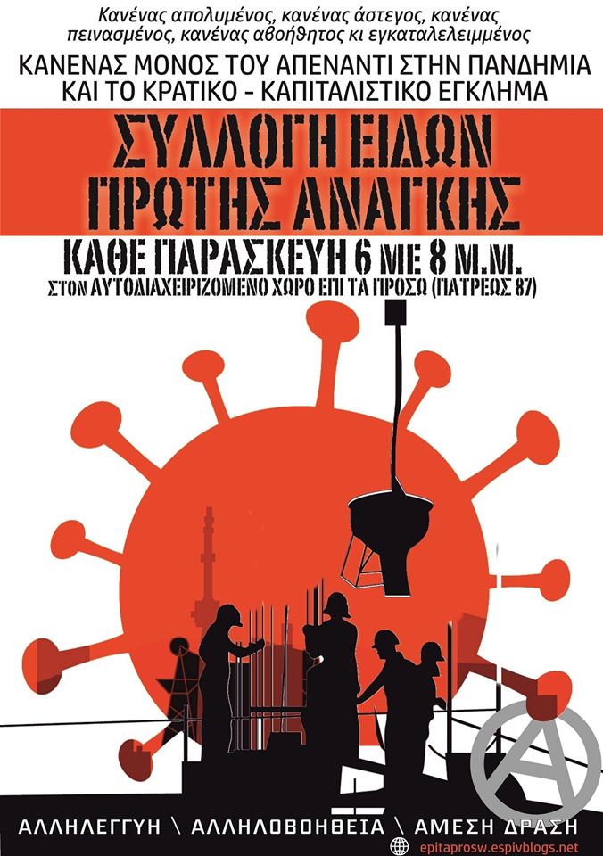 Οι πόροι για την προστασία του κοινωνικού συνόλου υπάρχουν και τους έχουμε παράξει οι εργαζόμενοι, ωστόσο η διαχείρισή τους βρίσκεται στα χέρια ελάχιστων οι οποίοι έχουν επανειλημμένα αποδείξει πως αδιαφορούν για τις ανθρώπινες ζωές, μπροστά στην εξουσία και τα κέρδη τους. Καθώς λοιπόν γνωρίζουμε ότι το κράτος και το κεφάλαιο μόνο κατόπιν της κοινωνικής πίεσης είναι αναγκασμένα να παρέχουν τα στοιχειώδη, επειδή προτιμούν την διατήρηση της ισχύος και του πλούτου μιας ελάχιστης μειοψηφίας αντί της υγείας και της ζωής πολλών χιλιάδων, όταν και όπου το επιτάσσουν λόγοι συνείδησης θα βγούμε στο δρόμο για να αγωνιστούμε για τη ζωή και ενάντια στον θάνατο, λαμβάνοντας όμως όλα τα αναγκαία μέτρα ατομικής και συλλογικής προφύλαξης απέναντι στην πανδημία.