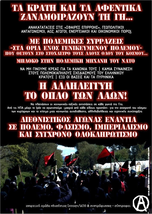 Από τη μεριά μας, ως αναρχικοί, θεωρούμε ότι ο πόλεμος είναι η αναπόφευκτη και μοιραία κατάληξη μιας κοινωνίας που είναι δομημένη πάνω σε εξουσιαστική βάση και στις άγριες ταξικές διακρίσεις. Αντιλαμβανόμαστε ότι η προοπτική των εμπόλεμων κοινωνιών, της φτώχειας, της εξαθλίωσης και των εκατομμυρίων θανάτων θα έχει ολέθρια αποτελέσματα για την ανθρωπότητα. Αναγνωρίζουμε, ότι οι πόλεμοι γίνονται για να εξυπηρετήσουν τα συμφέροντα των ισχυρών αυτού του κόσμου, οι οποίοι μετατρέπουν τη γη σε σφαγείο, αδιαφορώντας για οτιδήποτε άλλο πέρα απο τα κέρδη τους και την άυξηση της εξουσίας και της δύναμής τους. Έτσι, οι απο τα κάτω αυτού του κόσμου, δεν είναι δυνατόν να έχουν κανένα όφελος από τη γενίκευση του πολέμου και οφείλουν να αντισταθούν με κάθε τρόπο σε αυτόν.