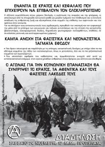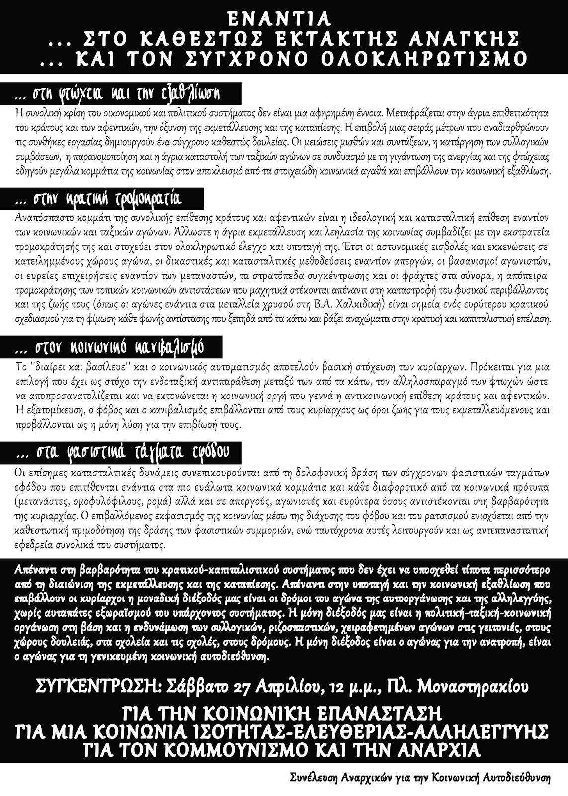 Για να επιτύχουν τους αντικοινωνικούς τους σχεδιασμούς, προωθούν την υποταγή και τον εκφασισμό της μέσα από το χτύπημα των κοινωνικών και ταξικών αντιστάσεων και την ένταση της καταστολής (βασανιστήρια, κακουργηματικές διώξεις, δημοσίευση φωτογραφιών συλληφθέντων, επιθέσεις σε συνελεύσεις γειτονιάς και αυτό-οργανωμένους χώρους).