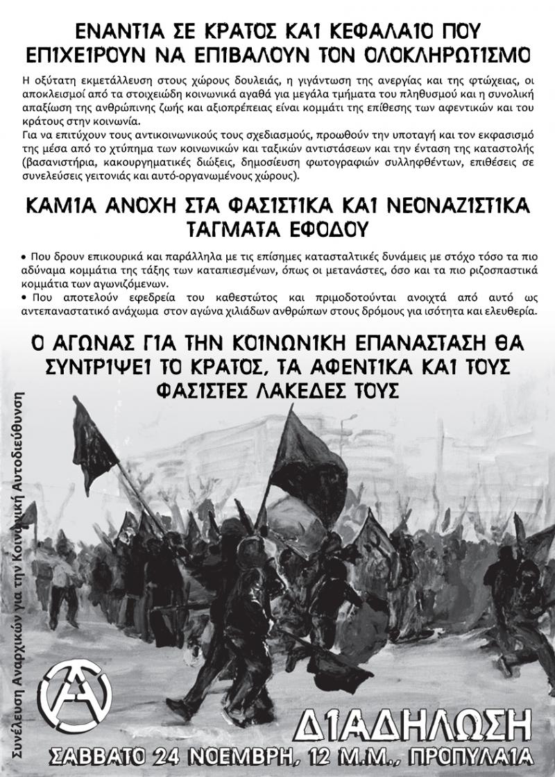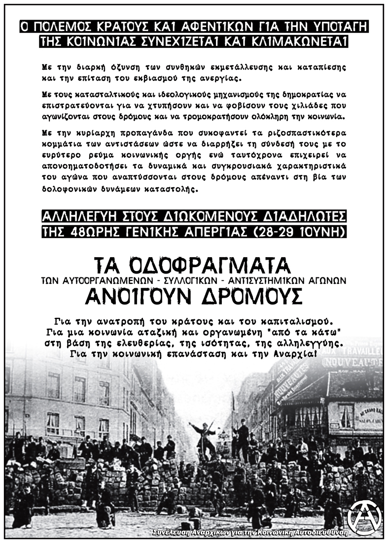 Aφίσα και κείμενο της Συνέλευσης Αναρχικών για την Κοινωνική Αυτοδιεύθυνση για τα γεγονότα της 48ωρης