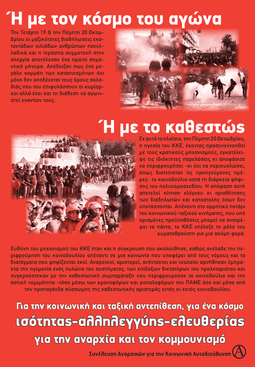 Σε αυτό το πλαίσιο, την Πέμπτη 20 Οκτωβρίου, η ηγεσία του ΚΚΕ, έχοντας προσυνεννοηθεί με τους κρατικούς μηχανισμούς, εγκατέλειψε τις ιδιόκτητες παρελάσεις κι αποφάσισε να περιφρουρήσει-κι όχι να περικυκλώσει, όπως διατείνονταν τις προηγούμενες ημέρες-το κοινοβούλιο κατά τη διάρκεια ψήφισης του πολυνομοσχεδίου. Η απόφαση αυτή αποτελεί κίνηση ελέγχου κι οριοθέτησης των διαδηλωτών και καταστολής όσων δεν υποτάσσονται. Απέναντι στο ορμητικό ποτάμι του κοινωνικοί-ταξικού κινήματος, που υπό ορισμένες προϋποθέσεις μπορεί να ανατρέψει τα πάντα, το ΚΚΕ επέλεξε το ρόλο του κυματοθραύστη για μια ακόμη φορά. Λειτουργώντας ως ανεπίσημος, εσωτερικός, κατασταλτικός μηχανισμός το ΚΚΕ, με όχημα το ΠΑΜΕ, επιχείρησε να επιβάλλει την ηγεμονία του στους δρόμους, να προκαθορίσει την έκταση και το περιεχόμενο των κοινωνικών και ταξικών αντιστάσεων φέρνοντάς τες στα μέτρα του. Η επιλογή της συγκρότησης αλυσίδων από τα ΚΝΑΤ, στραμμένες προς την υπόλοιπη διαδήλωση, υποκαθιστώντας τα ΜΑΤ και προστατεύοντας τη Βουλή, ήταν μια επιλογή εχθρική απέναντι στον κόσμο που αντιστέκεται στην εξαθλίωση της ζωής του. Ευθύνη του μηχανισμού του ΚΚΕ ήταν και η σύγκρουση που ακολούθησε, καθώς ανέλαβε την περιφρούρηση του κοινοβουλίου απέναντι σε μια κοινωνία που υποφέρει από τους νόμους και τα διατάγματα που ψηφίζονται εκεί. Αναρχικοί, αριστεροί, ανένταχτοι και νεολαίοι αρνήθηκαν έμπρακτα την ηγεμονία ενός πυλώνα του συστήματος, των επίδοξων δικτατόρων του προλεταριάτου, και συγκρούστηκαν με την καθεστωτική συμπαράταξη που περιφρουρούσε το κοινοβούλιο και την αστική νομιμότητα, τόσο μέσω των κρανοφόρων και ροπαλοφόρων του ΠΑΜΕ όσο και μέσα από την προπαγάνδα σύσσωμης της καθεστωτικής αριστεράς (εντός κι εκτός κοινοβουλίου) μετά τα γεγονότα. Οι κρανοφόροι και παλουκοφόροι των ΚΝΑΤ απαγόρευσαν εξ’ αρχής σε όποιον δεν ήταν μέλος του κόμματος να προσεγγίσει τη Βουλή και τη λεωφόρο Αμαλίας, επιτέθηκαν στους διαδηλωτές με ξύλα και πέτρες, πέταξαν άτομο μεγάλης ηλικίας από ύψος 5 μέτρων στην πλατεία Συντάγματος, τραμπούκισαν και ξυλοκόπησαν κόσμο.
