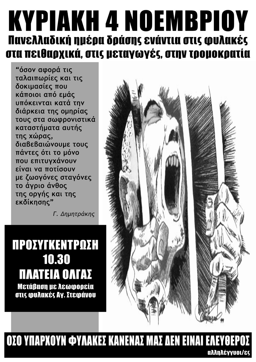 Υπενθυμίζουμε πως στο πλαίσιο των κινήσεων αλληλεγγύης στους κρατούμενου καλείται ανοιχτή συνέλευση την Τρίτη 29 Οκτώβρη στις 17.00 στο Εργατικό Κέντρο Πάτρας για τη συνδιοργάνωση συγκέντρωσης αλληλεγγύης στις φυλακές Πάτρας.